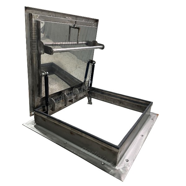Посадочный размер 800х800 (в свету по опорным поверхностям не менее 690х740) в раме из уголка 90х90 без утеплителя. Опционно борт можно изготовить в неравнополочном исполнении: