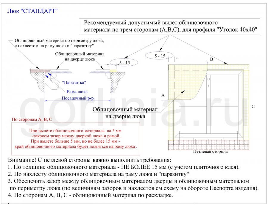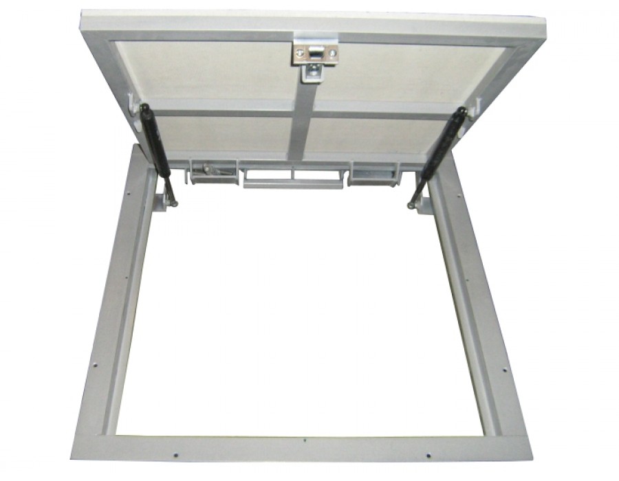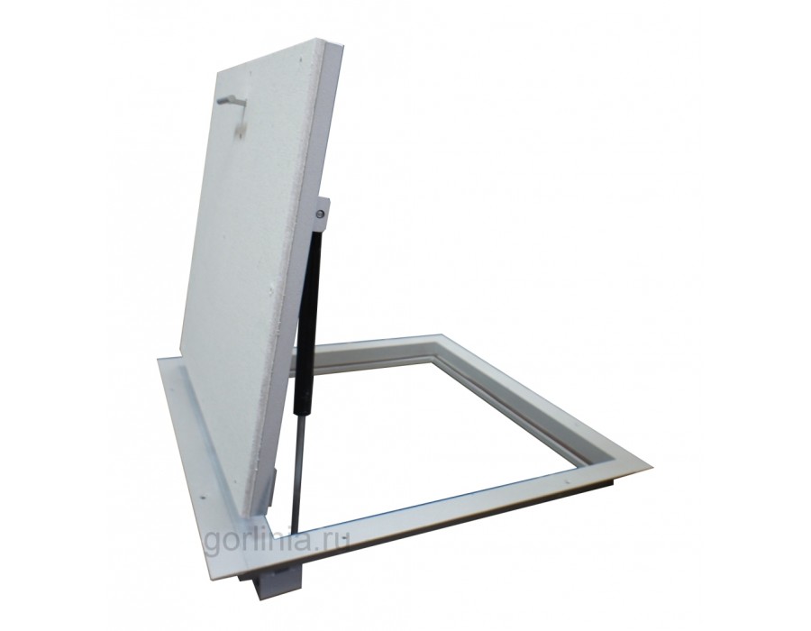 Скрытый напольный люк АМО из профильной балки 30х20 и равнополочного уголка 40х4мм окрашен порошковой эмалью в высокотемпературной камере. Интерьерное изделие оснащено газовыми стойками, скрытыми петлями и регулируемым замком со съемной ручкой. Тип открывания демпферной петли: распашной. Гипсоволокнистое полотно двери и наличник рамы выставлены в нулевую отметку под скрытую облицовку материалом отделки помещения.