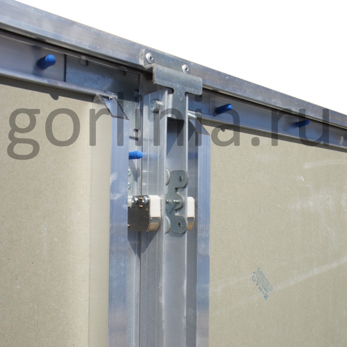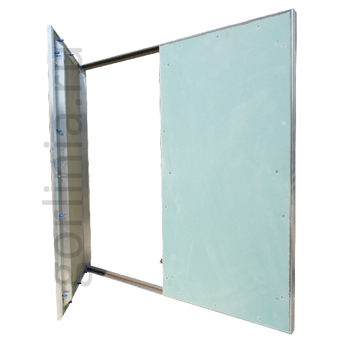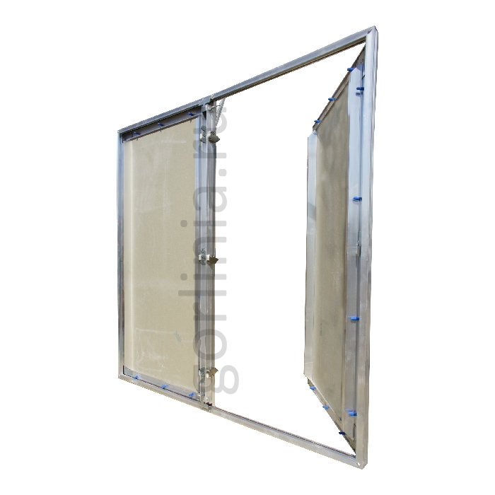 Нажимная дверца ходит на несъемных петлях с одной осью вращения, дополнительно фиксируется в коробке через съемную перемычку по центру. На больших створках в каркас закладываются элементы дополнительной обвязки.