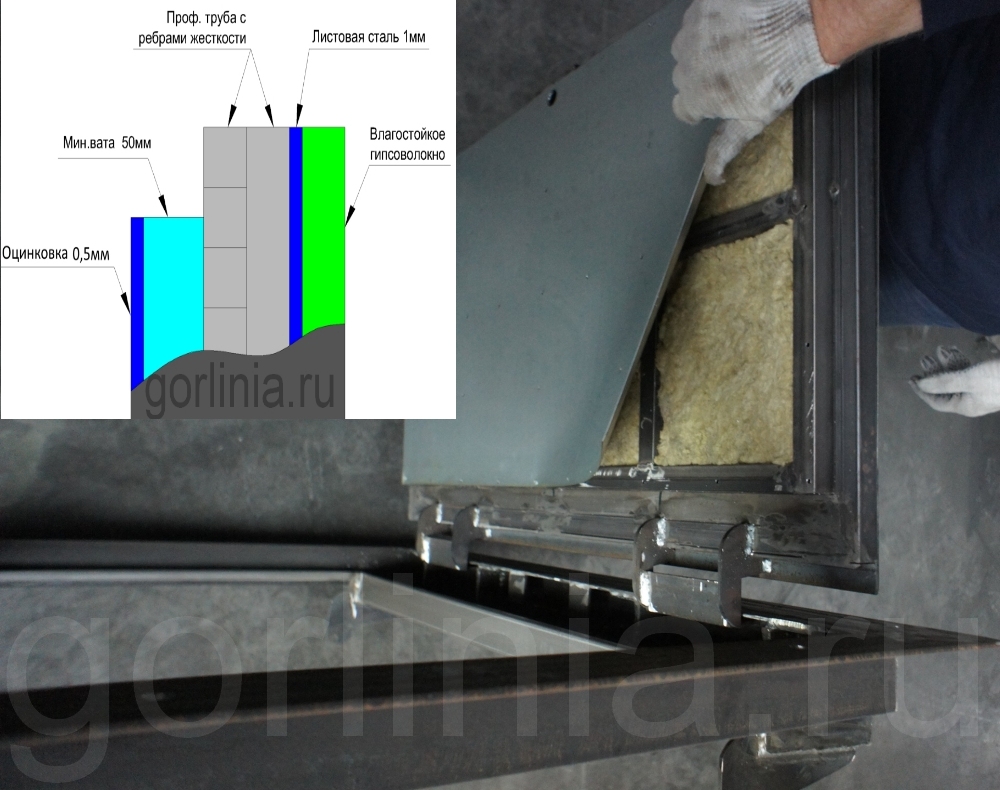 Минеральный утеплитель 50 мм проложен внутри каркаса, подшит снизу оцинкованным листом на клепку. Под шарнирным узлом приварен поддон, уплотнитель сплошной по притвору, сквозняка из подвала по ногам не будет.