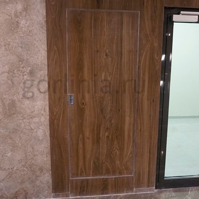Рама из коробчатого профиля с порогом без наличника с термоактивной лентой от холодного дыма. Распашная створка открывается на себя за ручку или нажатием, ходит на опорных подшипниках осевых петель. Заполнена листами ГВЛ и огнеупорным ГСП-DF с прокладкой минваты ρ≥150 кг/м³.