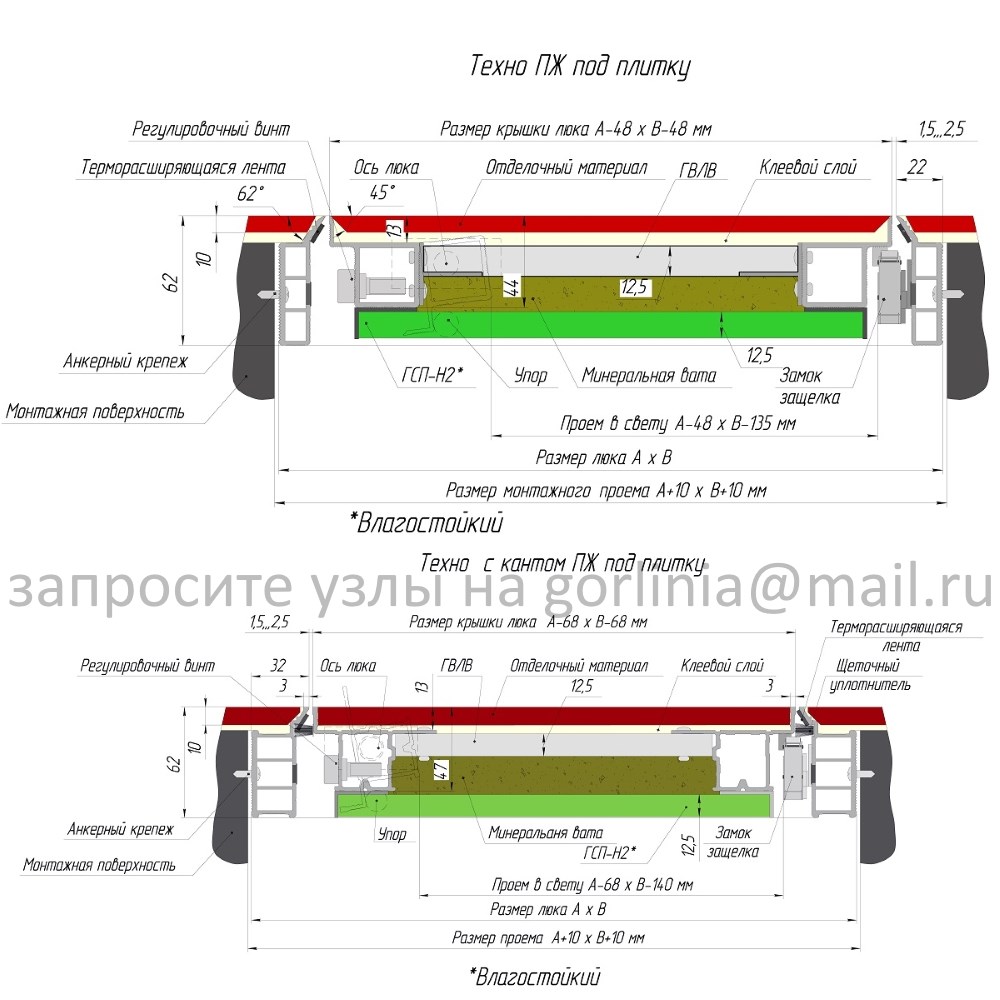 Декоративная отделка с внешней стороны. Нагрузка на коробчатый профиль и шарниры ограничена значением 60 кг на 1 м² площади дверцы. Люк технический для закрытия ревизионных ниш и шахт в стенах на пути эвакуации людей.